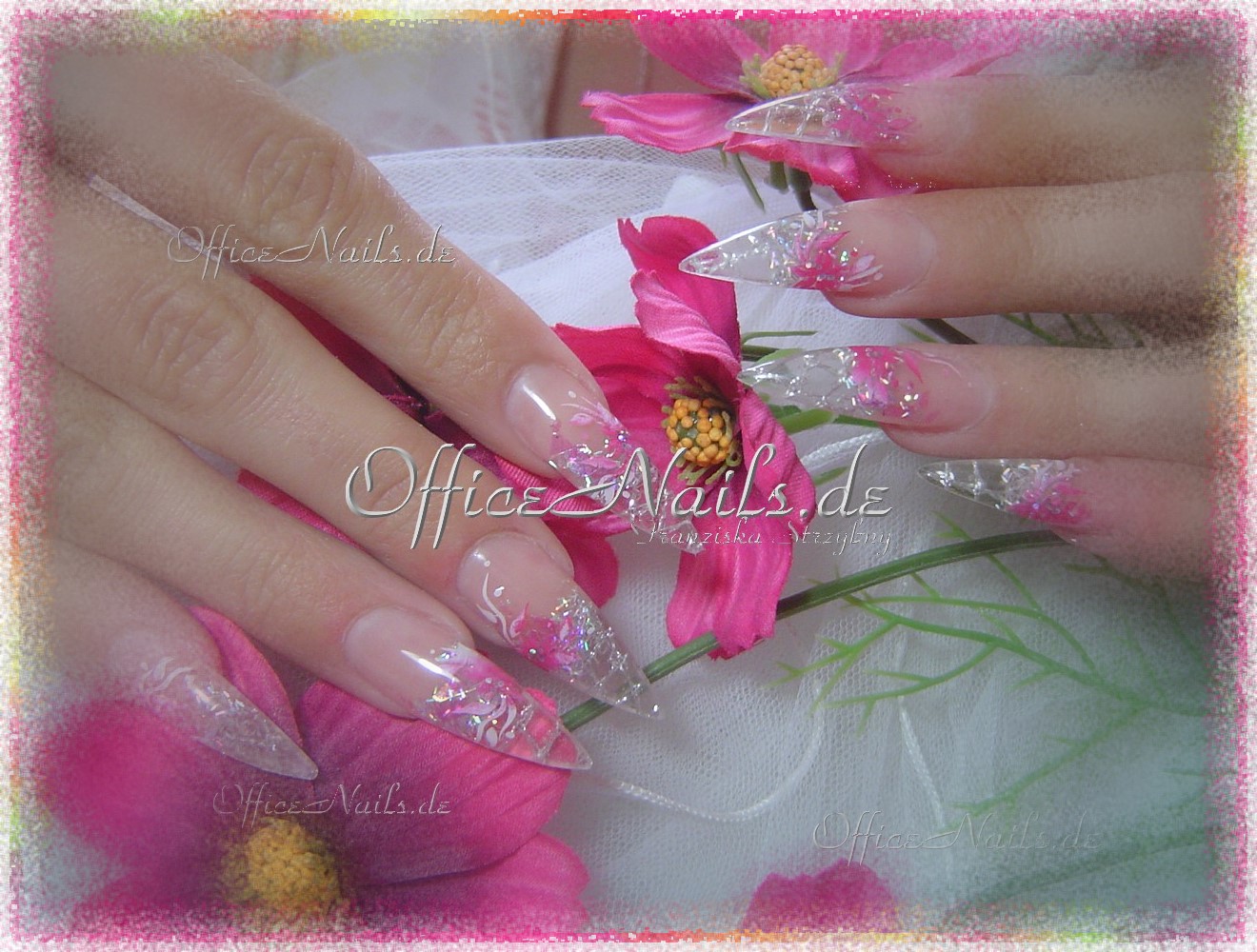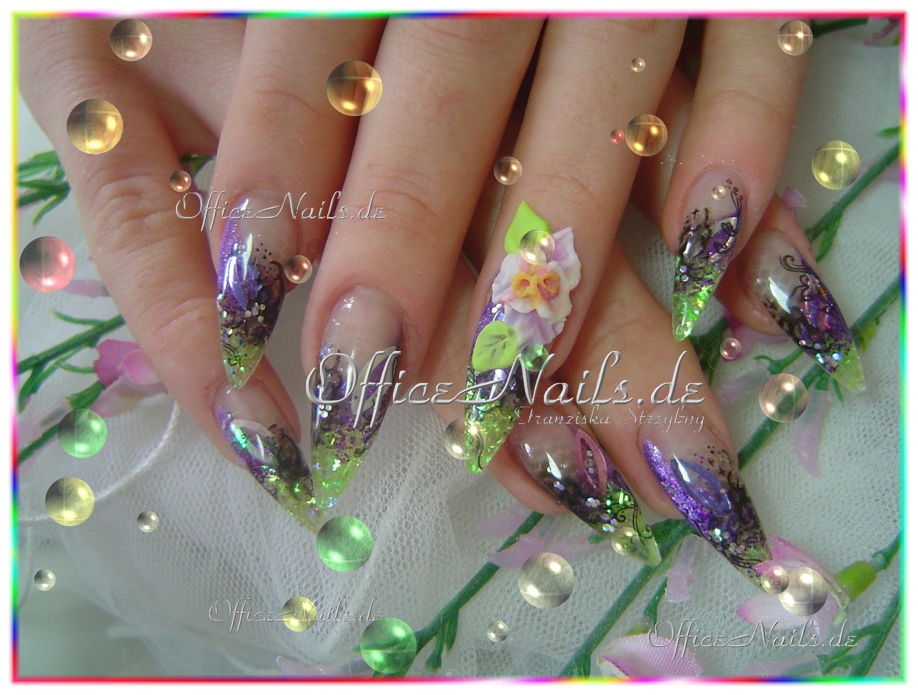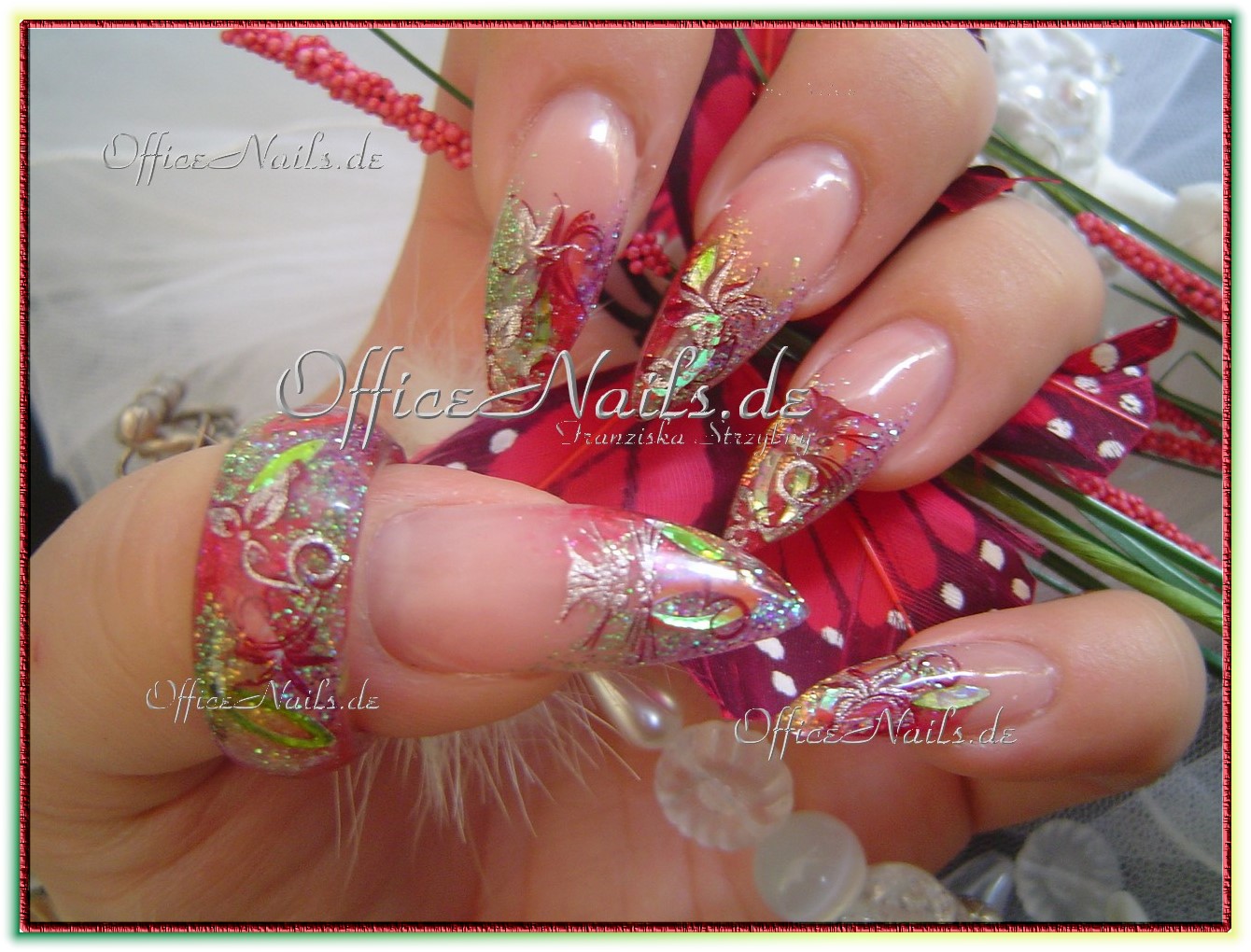 Glitterfädchen und crushed ice, sowie Blütenranken.