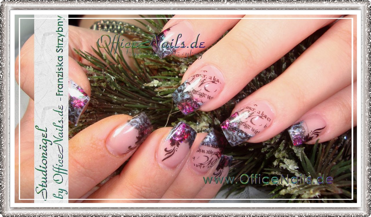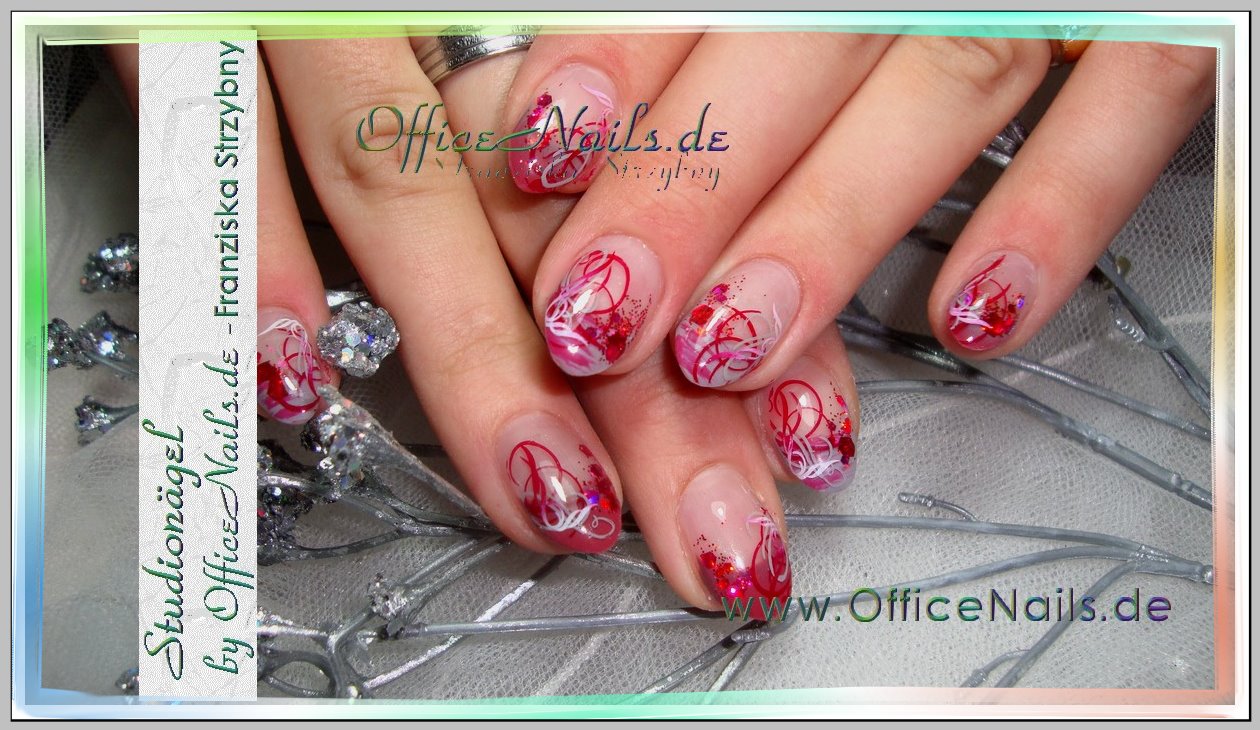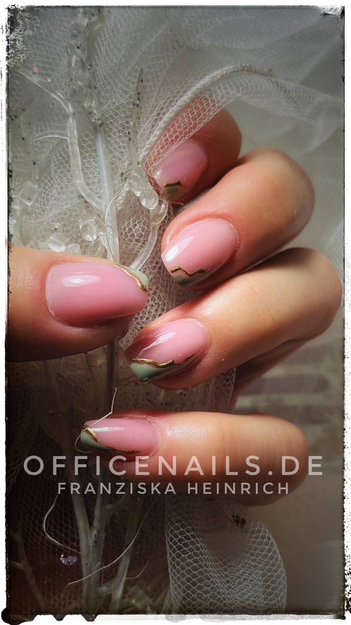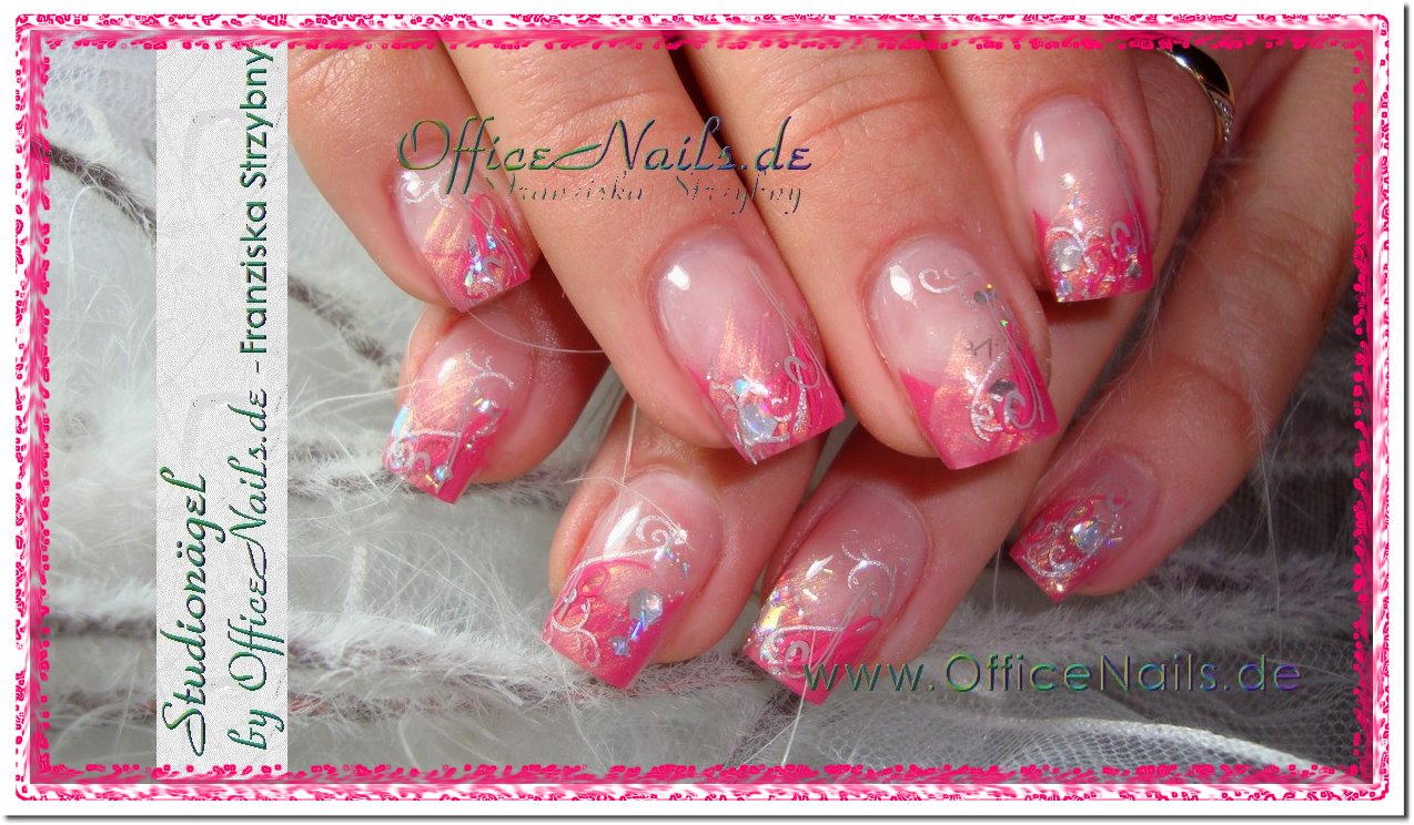 Pinkes French hier mit apricot und Glitter, zarte Ranken oben auf.