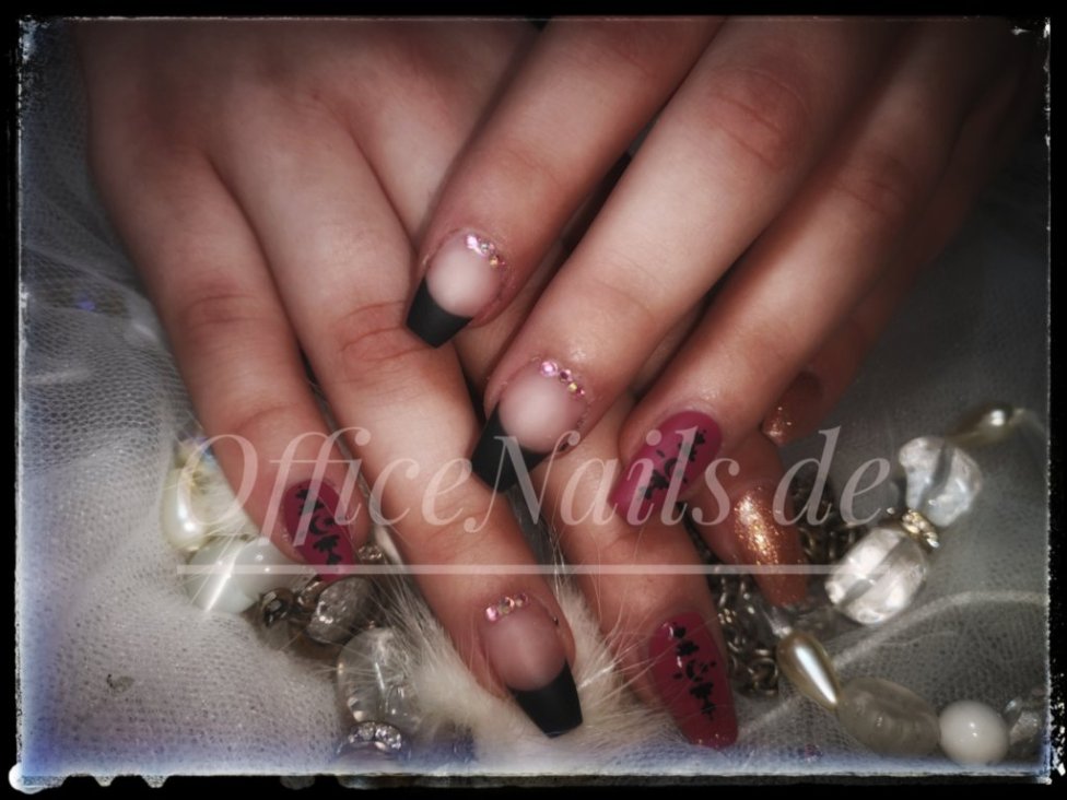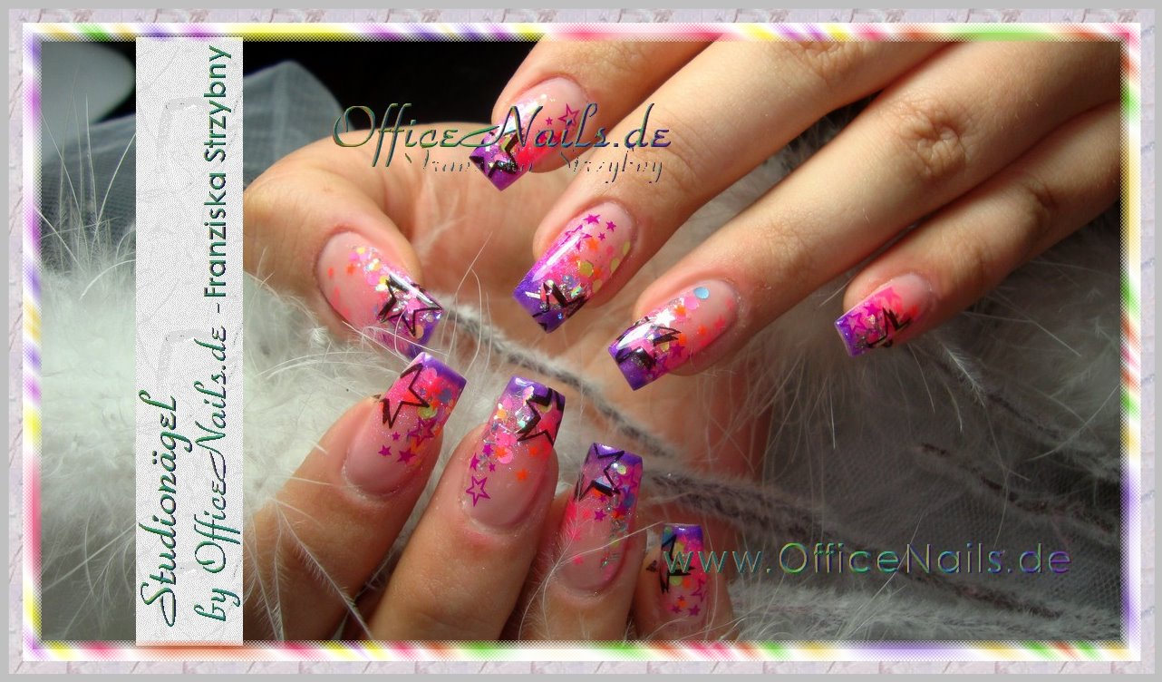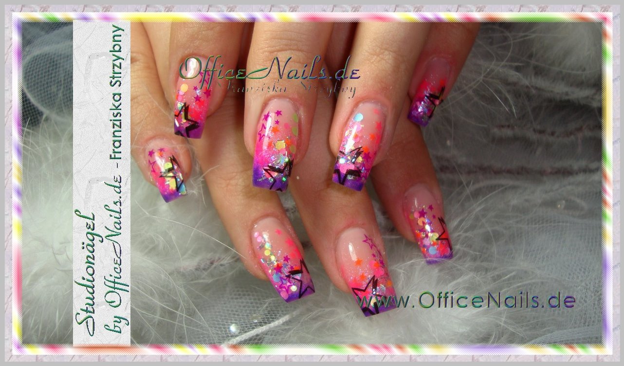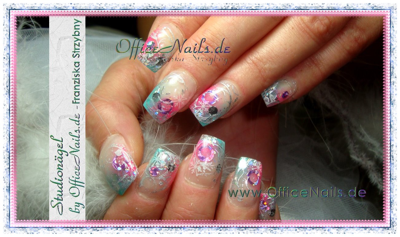 Pinkes French hier mit apricot und Glitter, zarte Ranken oben auf.